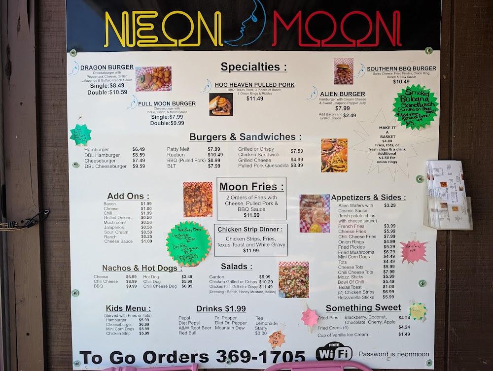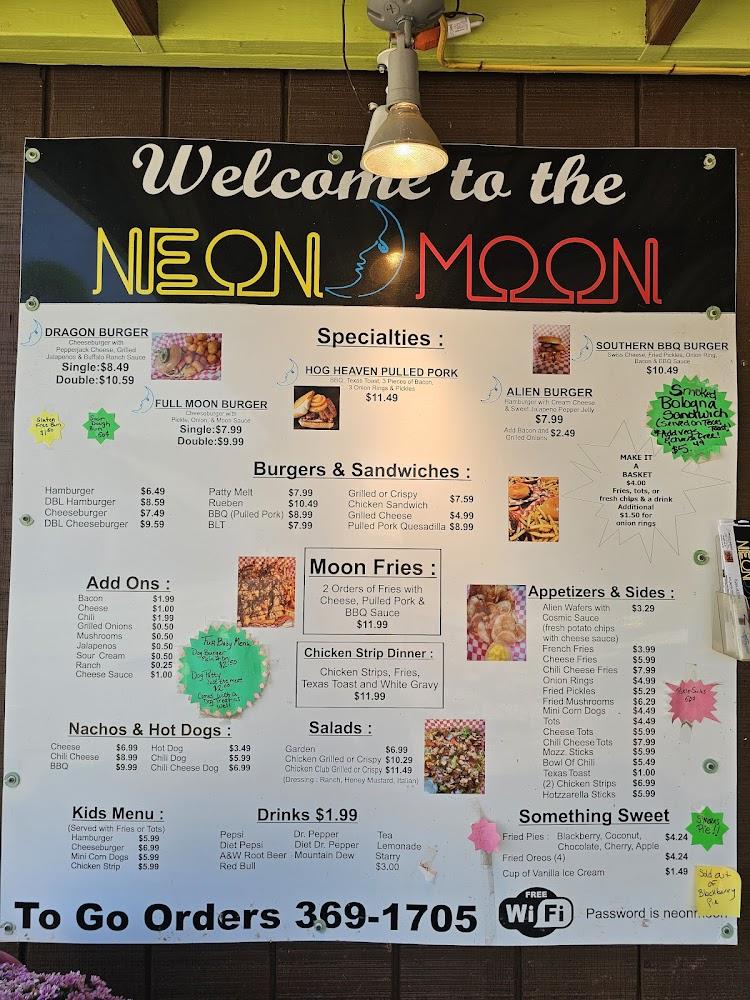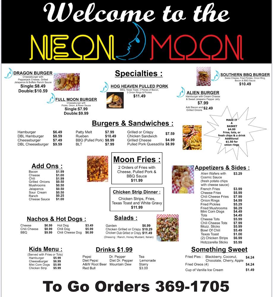 Neon Moon boasts a diverse menu filled with classic and original delights. Specialty burgers take center stage, including the Alien Burger and Hog Heaven Pulled Pork sandwich. Appetizers like cheese fries and fried mushrooms also tempt diners.